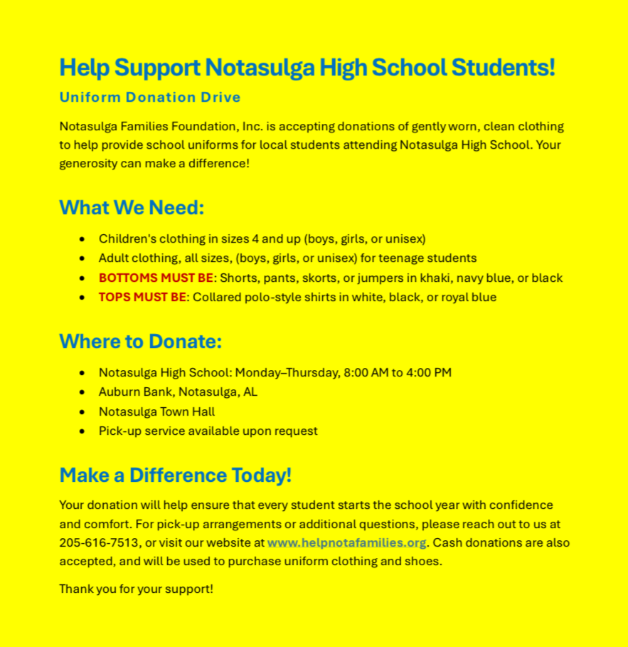Notasulga Families Foundation, Inc. conducts several fundraising drives throughout the year based on planned activities, events, and programs. Any monetary donation or in-kind trade of products and services is greatly appreciated. Your donation will be acknowledged and documented as a 501(c)(3) charity gift. Please check with your tax advisor for further information.